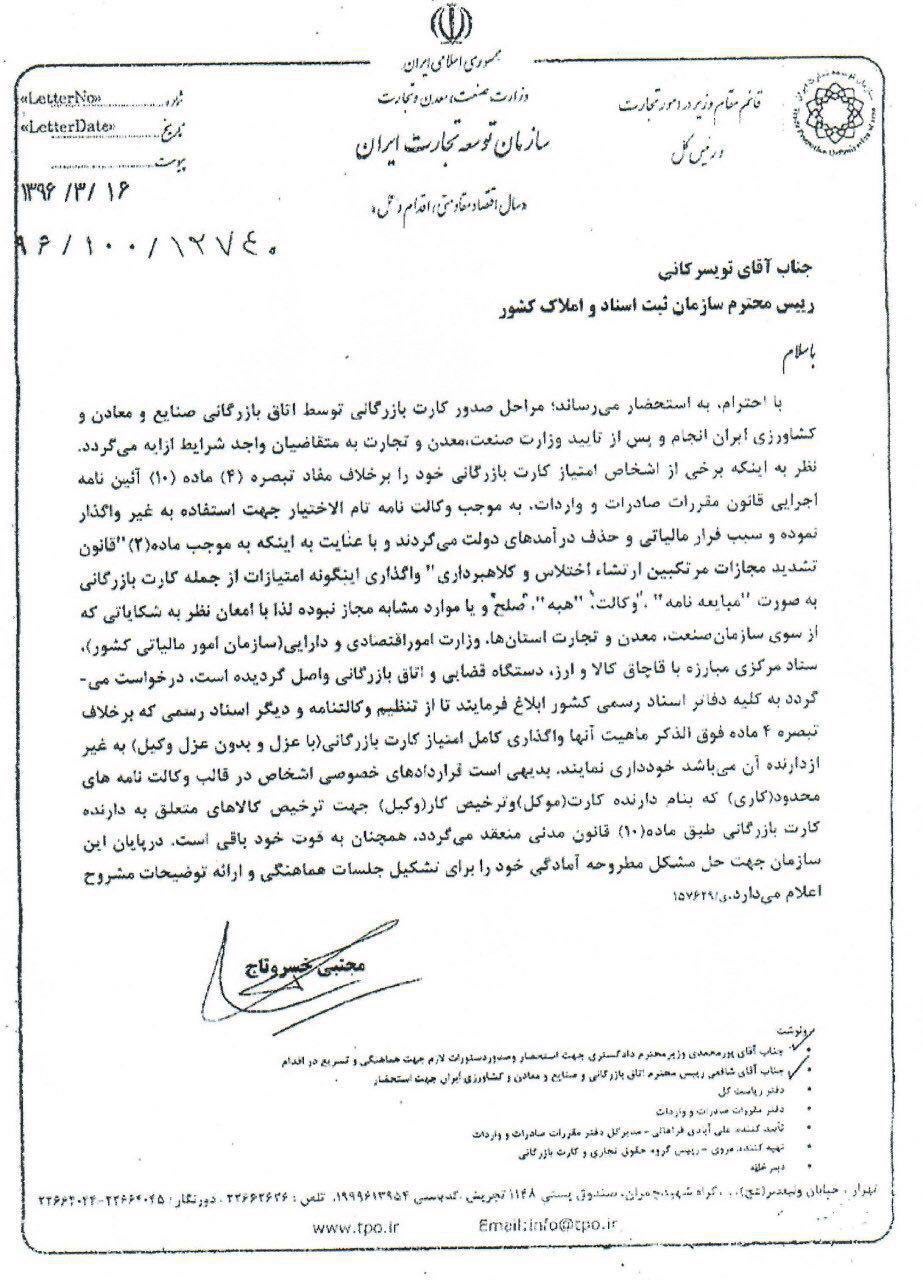ممانعت از تنظیم وکالتنامه و دیگر اسناد رسمی جهت واگذاری کامل امتیاز کارت بازرگانی