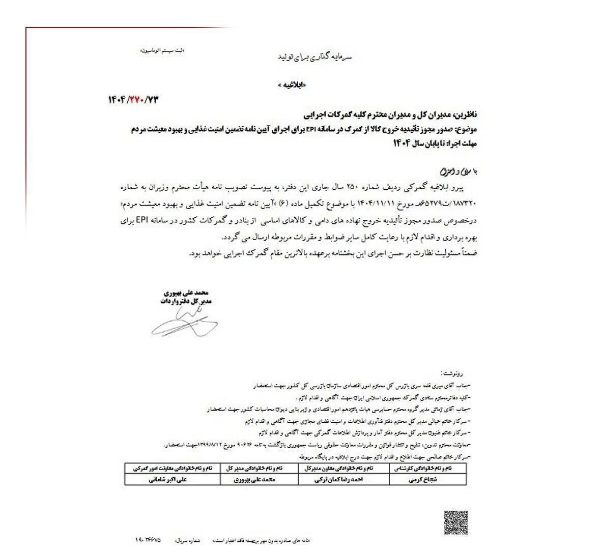این ابلاغیه که به امضای مدیرکل دفتر واردات گمرک رسیده است، پیرو مصوبه هیأت وزیران (شماره ۱۸۷۳۲۰/ت۶۲۷۹۶هـ مورخ ۱۴۰۳/۱۱/۱۱) صادر شده و بر اجرای دقیق آییننامه "تضمین امنیت غذایی و بهبود معیشت مردم" تأکید دارد.