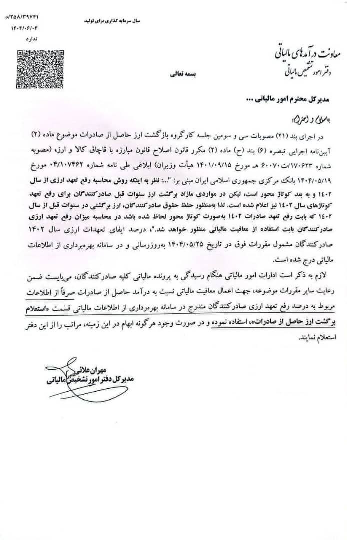 مطابق با ابلاغیه شماره ۲۵۸/۳۹۷۴۱/د، معاونت درآمدهای مالیاتی کشور، جزئیات جدیدی را در خصوص نحوه محاسبه رفع تعهد ارزی صادرکنندگان ابلاغ کرده است. این بخشنامه بر اساس مصوبات سی و سومین جلسه کارگروه بازگشت ارز حاصل از صادرات تدوین شده و هدف آن شفاف‌سازی روند اعطای معافیت‌های مالیاتی است.